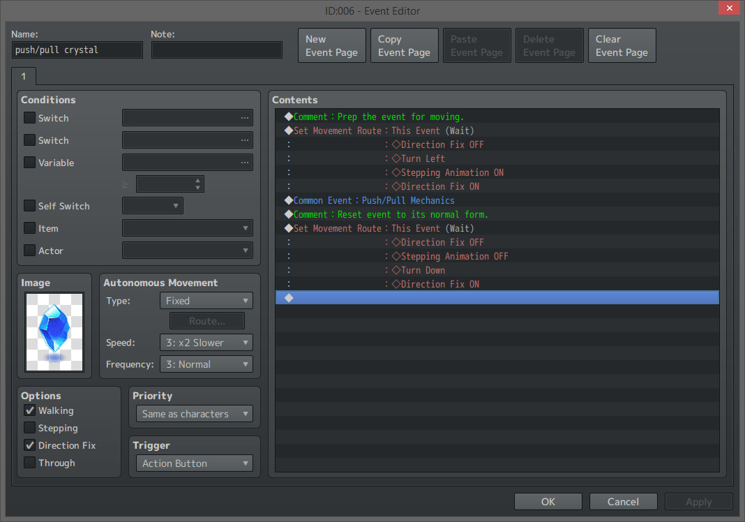 With our common event all set up, we can create our events now. Instead of rolling rocks, let’s make the events all crystals that light up and sparkle when they’re being moved. Since we didn’t add in any changes to the events in the common event, we’ll want to use a move route that turns on the stepping animation and lights the crystal up (we’ll use one of the Turn options, and figure out which one is right for the crystal by looking at its spritesheet) before calling the common event, and another one that turns the crystal back to normal once the player lets go.
