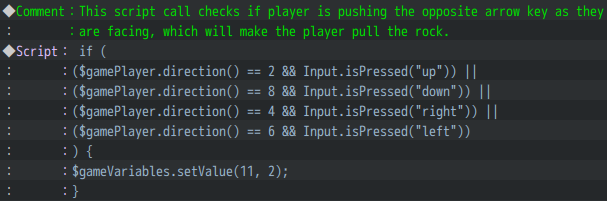 Next we need to figure out if the player is trying to push or pull the event. To do that, let’s come up with a way to check the direction the player is facing and if they’re hitting the arrow key that either matches that direction or is the opposite direction. If the arrow key matches the player’s direction they’ll be pushing the event and if it’s the opposite direction then the player will be pulling. We can do this in a few different ways, so let’s look at how we could do it with just event commands and with script calls.