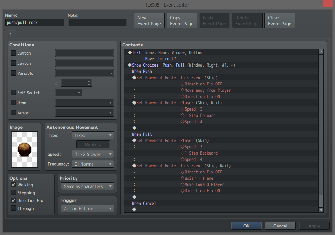 The event’s move route first needs to turn off direction fix so that it will look like it’s rolling in the right direction. Once that’s done, we’ll rely on Move Away from Player when we’re pushing and Move Toward Player when pulling to have the rock move properly. We do need to add a minor Wait to the pulling move route since the engine will think the player is still in the way if there isn’t a wait, but since one frame is 1/60th of a second players won’t even notice