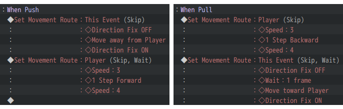 After getting those two things set up, our event can properly check if the player wants to push or pull, but doesn’t actually do anything about that. So we’ve got to add in move routes for the event and player, which we’ll put into Conditional Branches that check our variable we used earlier so that the right move routes play.