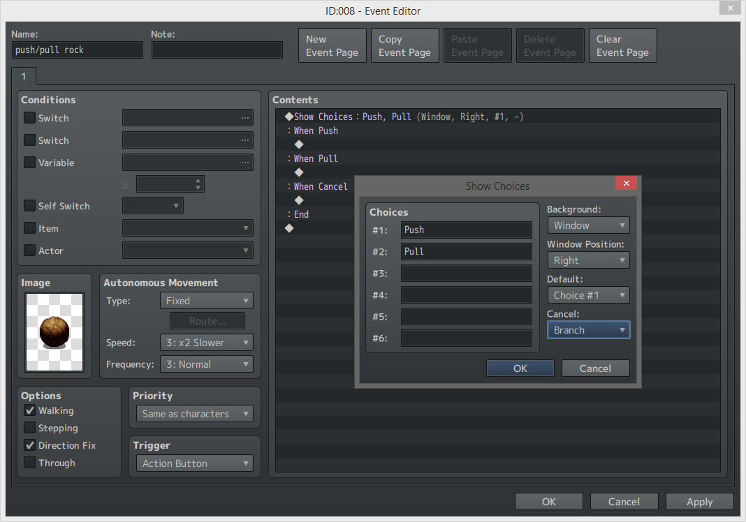 Before we try any complicated eventing, let’s start with a simple version. We just want to give our players the option to push and pull an event without causing issues, and an easy way to do that is to use Show Choices to let our players pick what they want to happen. So let’s set up an event with a round rock as the image and pull up the Show Choices event command. For simplicity's sake, we’ll just name the two choices we need Push and Pull. We could also write out a Cancel option as a choice, but for this event we’ll choose Branch as the Cancel option from the list on the right of the command so that we can give the players an option to not move the event just by hitting the in-game cancel button.