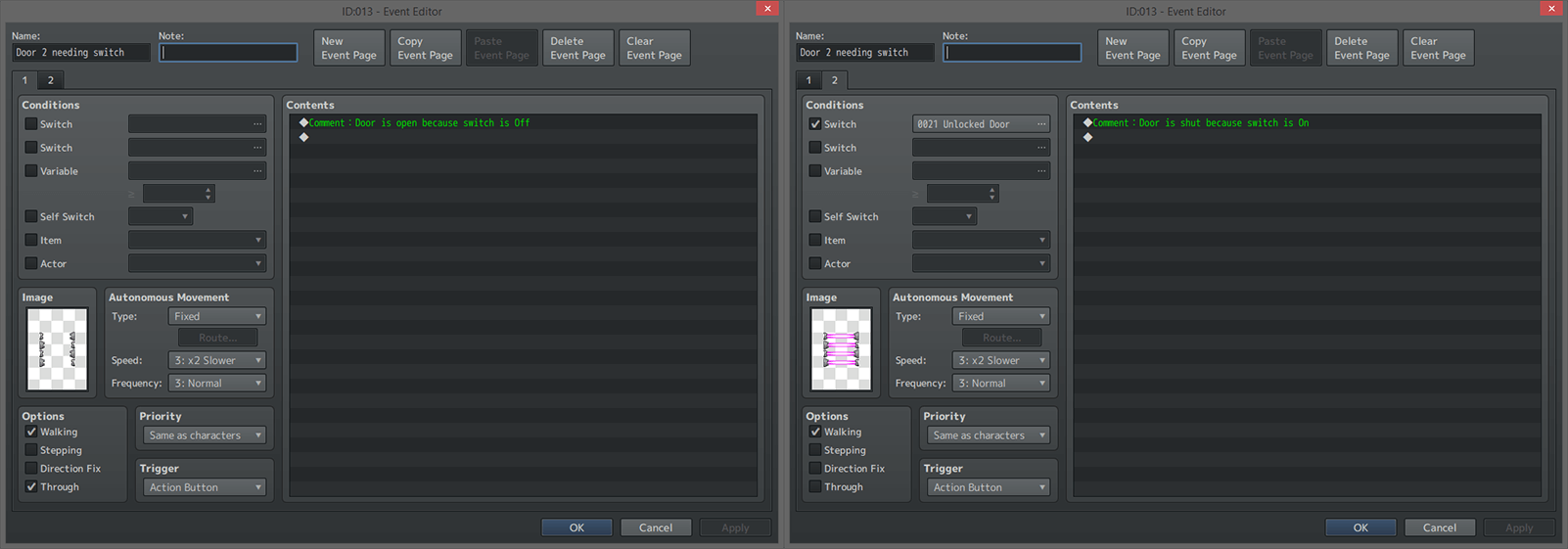 The other two events are the locked doors themselves. In this example we’re using lasers, but the same concept works for any type of doors or blocked paths. Door 1’s event has two pages, the first page having the lasers on so the player can’t get passed and the second page (which has its condition set to the switch) has the lasers off and is set to ‘Through’ in the page’s Options so that the player can pass through the event.