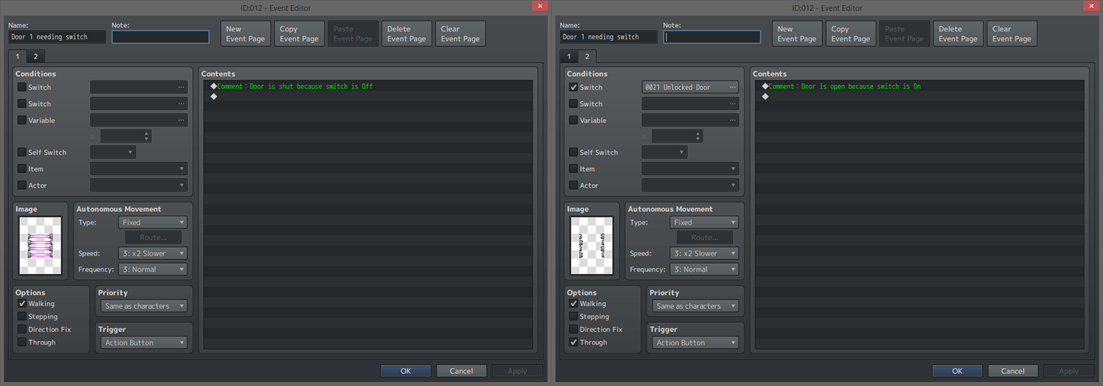 Many locked door events share a similar basic setup. The event has two pages, the first one where the door is locked and the second page where it isn’t. The second page relies on the page’s Conditions to keep the door locked until we want the player to open it. So once the player’s beaten a certain boss or has found the right item, the door’s event will use page 2 and let the player move forward with the game.