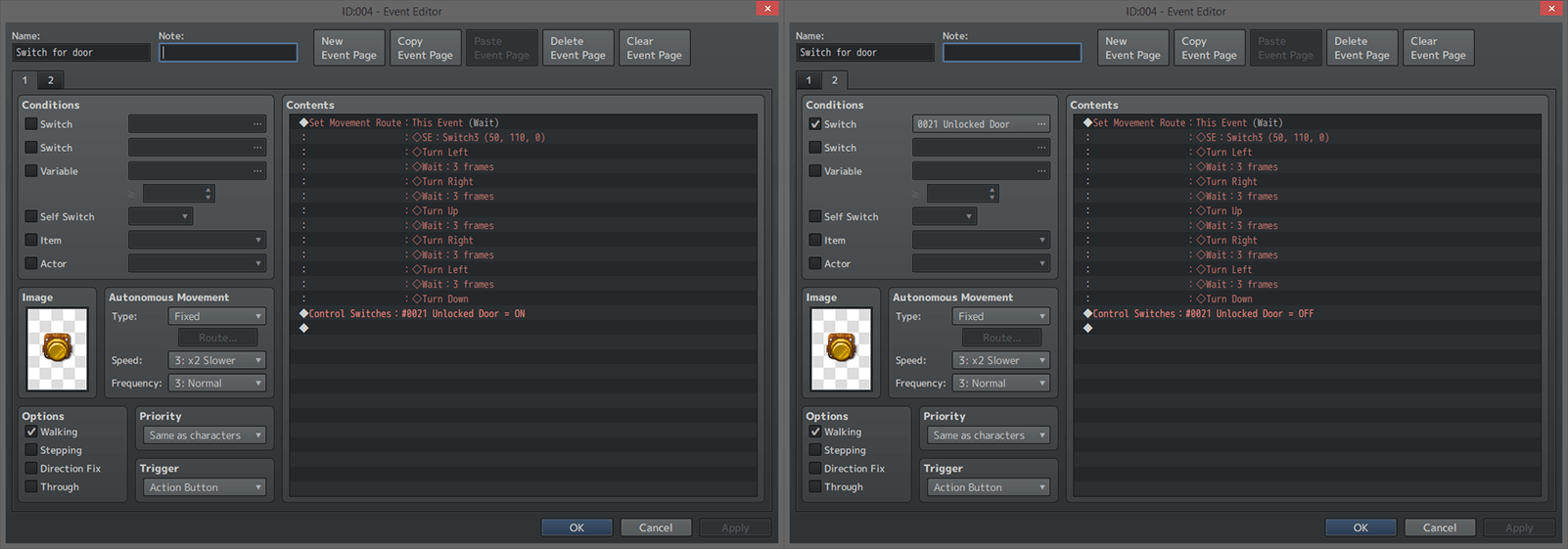 Setting it up requires three main events that we can copy and paste around the map once we’ve made them. The first one is the switch itself, which is where the player can turn the switch on with page 1 or off with page 2. Since we’re already using a switch for this, we can set page 2’s condition to that switch so we don’t need to keep track of any other switches or self switches. To make sure the player knows that they did hit the button, a simple Move Route for the event plays a SE and turns the event in place so that button is pushed.