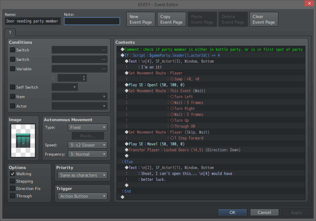 This example only uses one page, since Michelle needs to be the leader each time the player wants to go through the door. If we wanted the leader to unlock the door and keep it unlocked, then we can use a self switch and second page much like we did with the item event example.