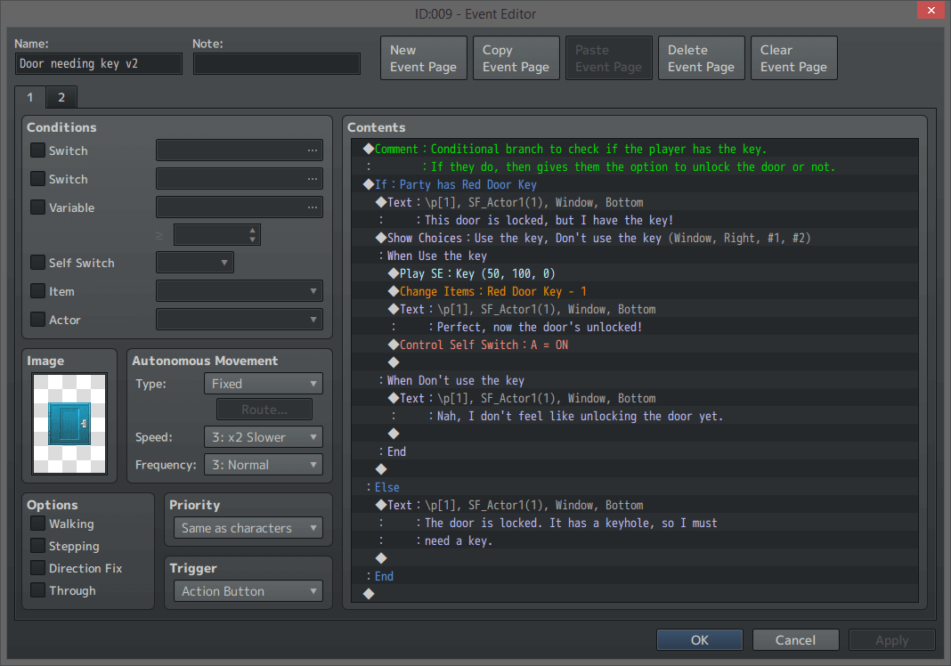 Once we’ve chosen a way for our players to get the key, we need to set up our door’s event. Which is as simple as setting up our event with page 2’s Conditions set to that item. As long as the player has the key item they can go through the door.