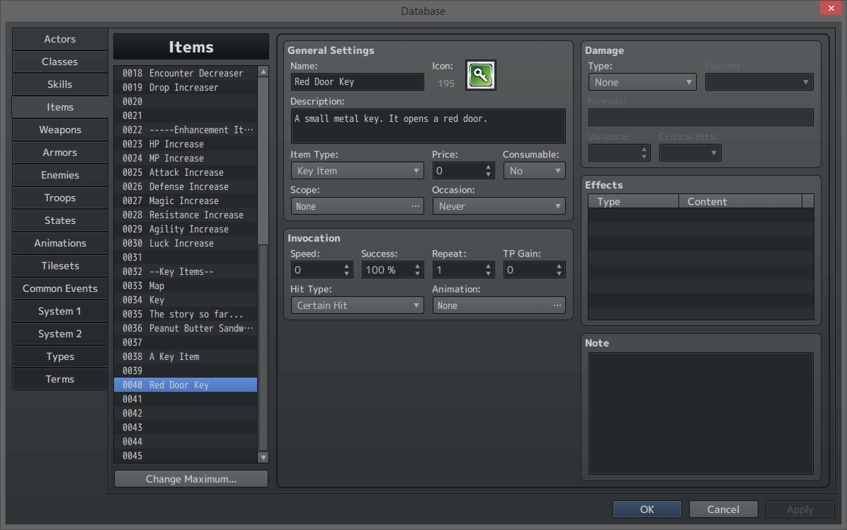 One way to unlock a door is pretty obvious: using a key! We can do that by making a key item in the Database that our players can find at some point while playing.
