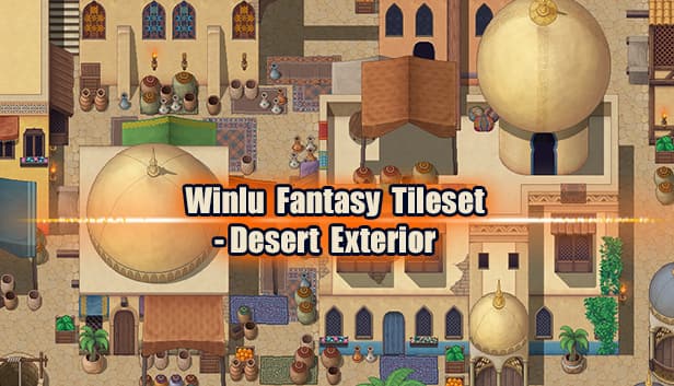 Explore towns built around oases and expanses of heat and sand with the Winlu Desert Exterior pack! Winlu is back with another tileset for MV and MZ, this time focusing on lots and lots of sand and on stone, clay, and fabrics that can turn an empty desert into a livable town. A1, A2, A3, A4, A5, and 5 B sheets are ready for you to create desert maps with abandoned watchtowers scattered between sand-covered roads and cacti, bustling merchant cities with statues guarding the gates and pots filled with food tucked behind pillows where your heroes can rest, and even rocky cliffs that lead to forgotten mines and partially buried pyramids! Fill the livelier towns with bright fabrics and lush plants between opulent towers and carved edges on flat roofs while smaller villages focus more on survival with simpler walls and windows, and workspaces for blacksmiths and travelers.