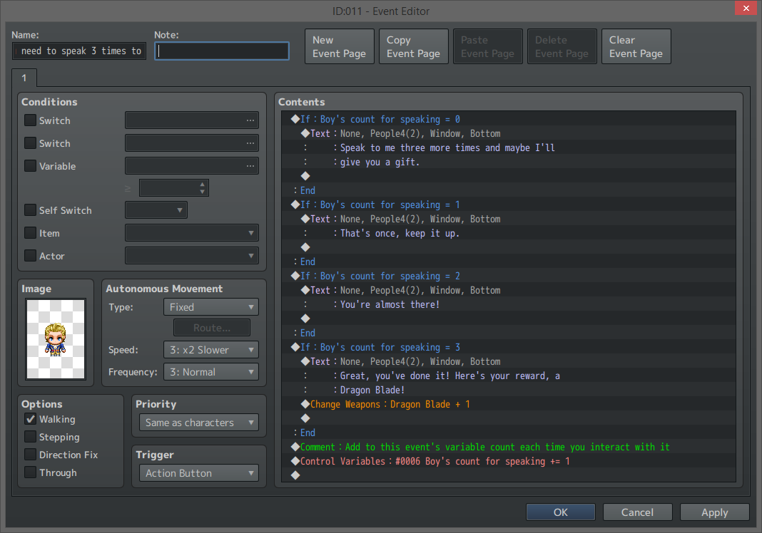 However, if you’re familiar with previous RPG Makers then you may have noticed an issue with the event page. Once the player has spoken to the NPC four times, he won’t say anything else since variable 6’s amount will be higher than any of the conditional branches. We could change the last one to check if it’s equal to or higher than 3, but then the player would get a new Dragon Blade each time. Instead, let’s add a second page to the event with the condition that variable 6 needs to be 4 or more. Now after the player has received the Dragon Blade any future interactions will just be page 2’s message.